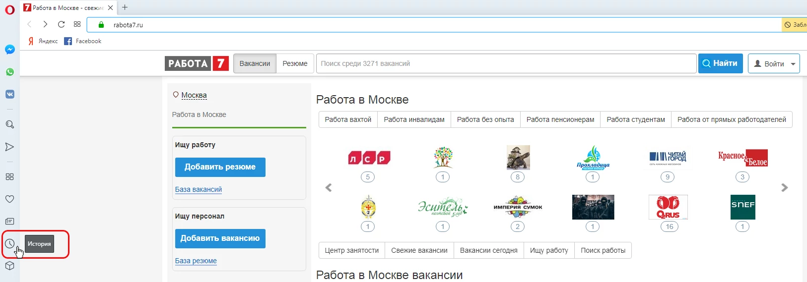 2. Выберите пункт "История";