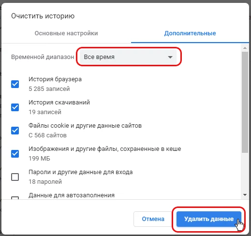 4. Выберите временной промежуток "За все время", галочкой отметьте "Файлы, сохраненные в кеше"